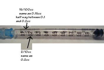 the skin, dosages can range from 1/10 to 4/10 cc,